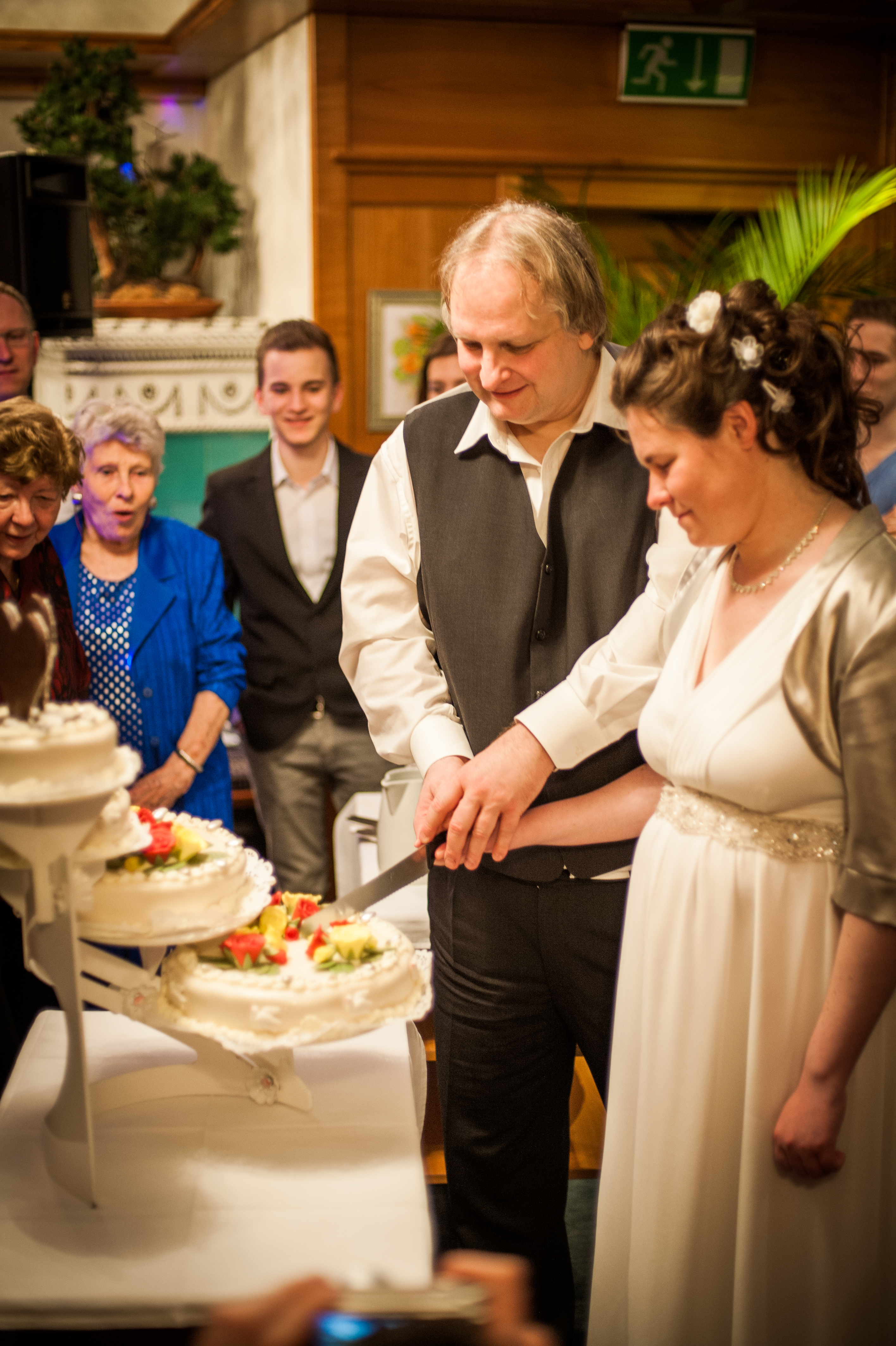Lothar und Diana schneiden die Torte an. Durch den Zuckerguss ist das gar nicht so einfach wie es erscheint.