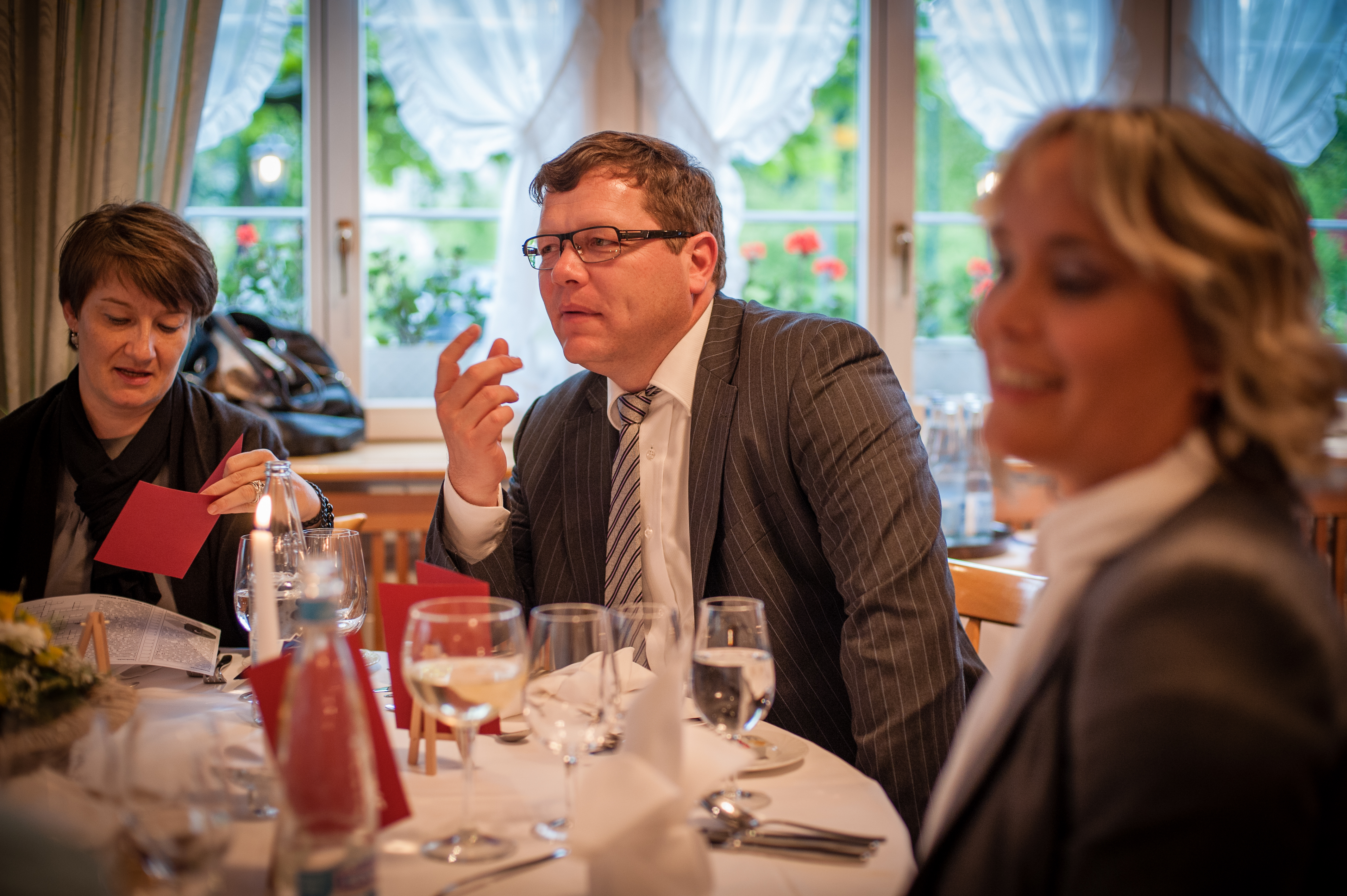 Jacqueline studiert das Menü während Stefan angeregt (vermutlich mit Dani) diskutiert.