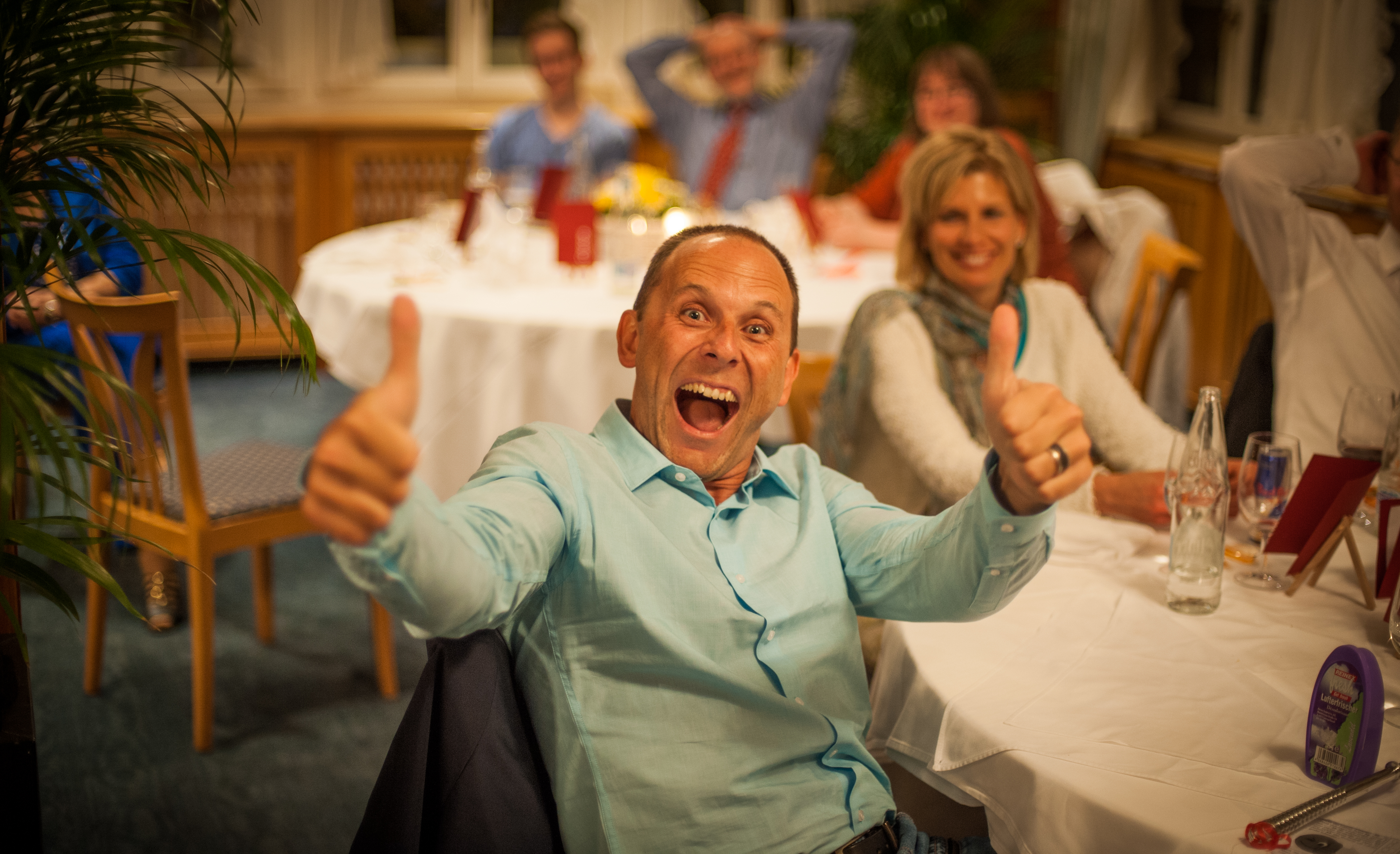 Dani ist offensichtlich ganz schön aufgedreht. Entweder er freut sich über unser Fest, oder er ist auf Drogen. Wir vermuten mal das erstere. Eine alternative Deutung wäre, dass er den ABC Vortrag von Hanspeter und Erich mit Beifall versehen will.